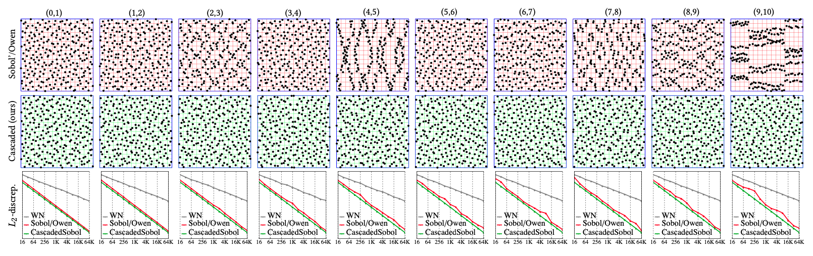Cascaded Sobol' Point Sets. For quasi-Monte Carlo integration problems, low discrepancy samplers, such as the Sobol' sequence with Owen scrambling [Owen 1998; Sobol' 1967], are widely used thanks to their ease of generating high-dimensional point sets. While being low discrepancy in high dimension, some projections may exhibit strong uniformity defects (illustrated here by consecutive 2-dimensional projections of an 11-dimensional point set in the first row). We propose a sampling strategy with perfect (0,m,2)−net properties (second row) for consecutive pairs of dimensions and optimized low discrepancy in high dimension, reducing errors in Monte Carlo rendering. The third row shows L2-discrepancies of first 10 consecutive 2-dimensional projections; (see paper Figure 7 for s-dimensional discrepancies).